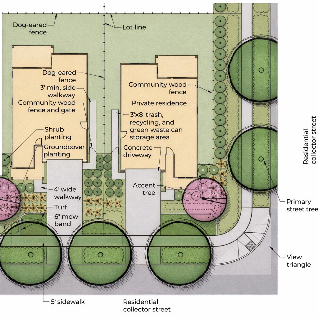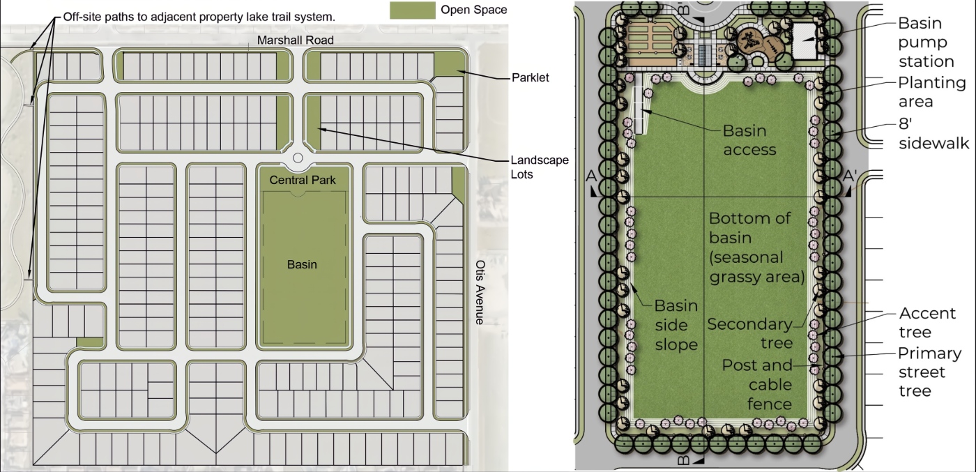 The project includes robust landscaping throughout the neighborhood—along the Marshall Road and Otis avenues perimeter, within internal streets, and around the community recreation basin. Primary trees near the park and main entry are planned with mature canopies typically 30–50 feet wide, and many residential streets will include 8-foot planter strips between sidewalks and the parking or bike lane.