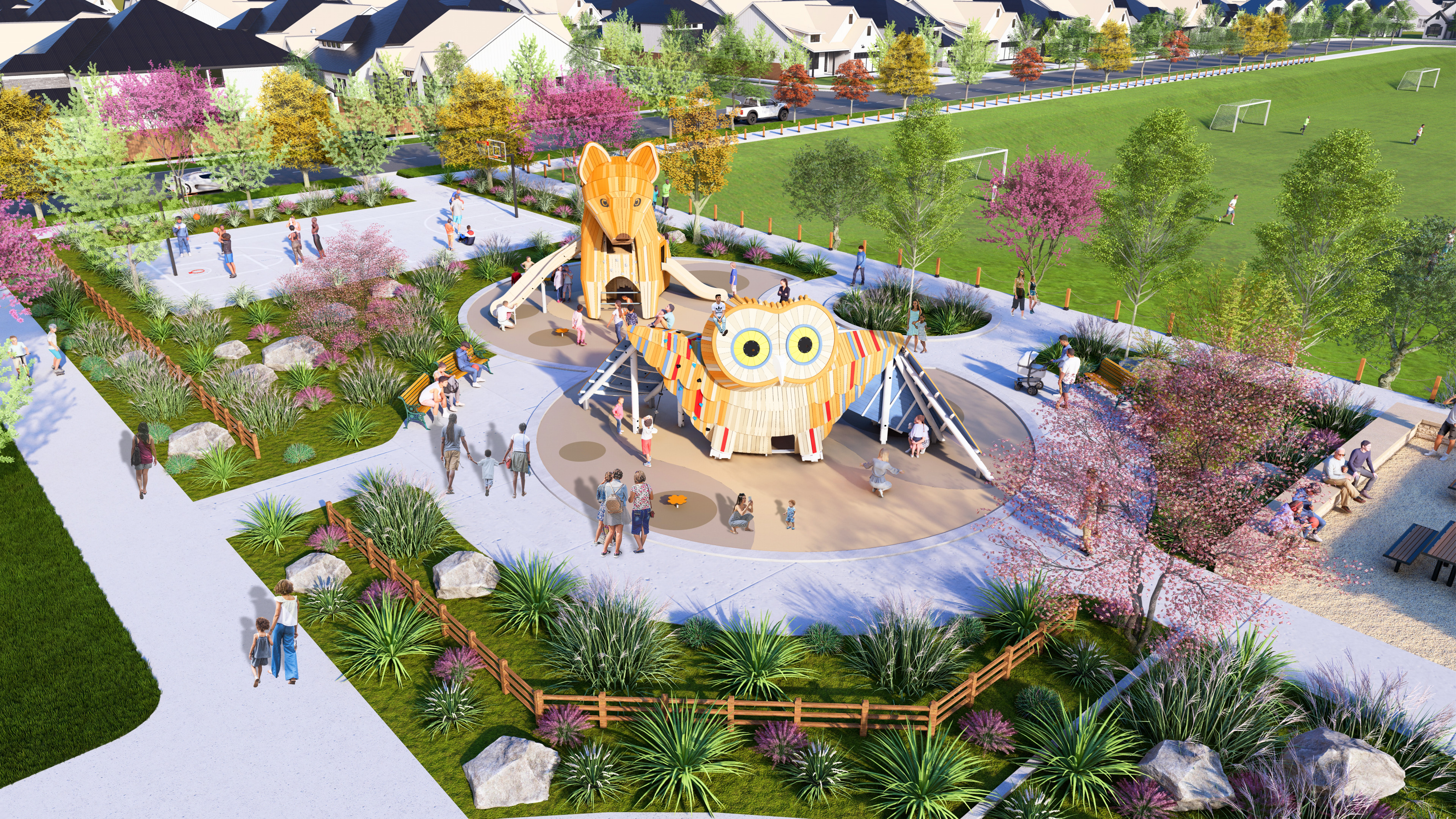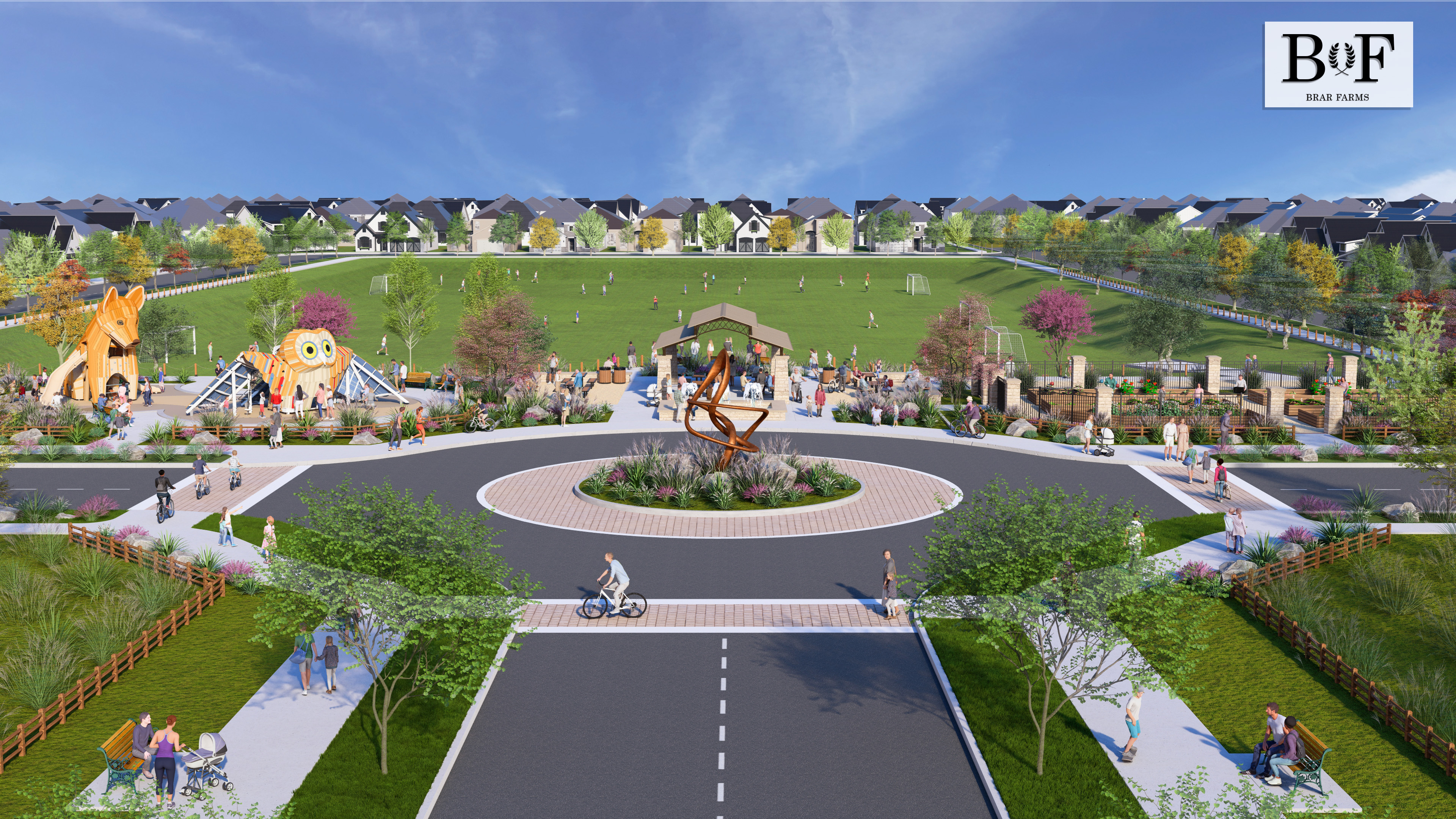 Green space is a central part of the Brar Farms design. The entrance includes a central park with a variety of family-focused features and activities that may include: