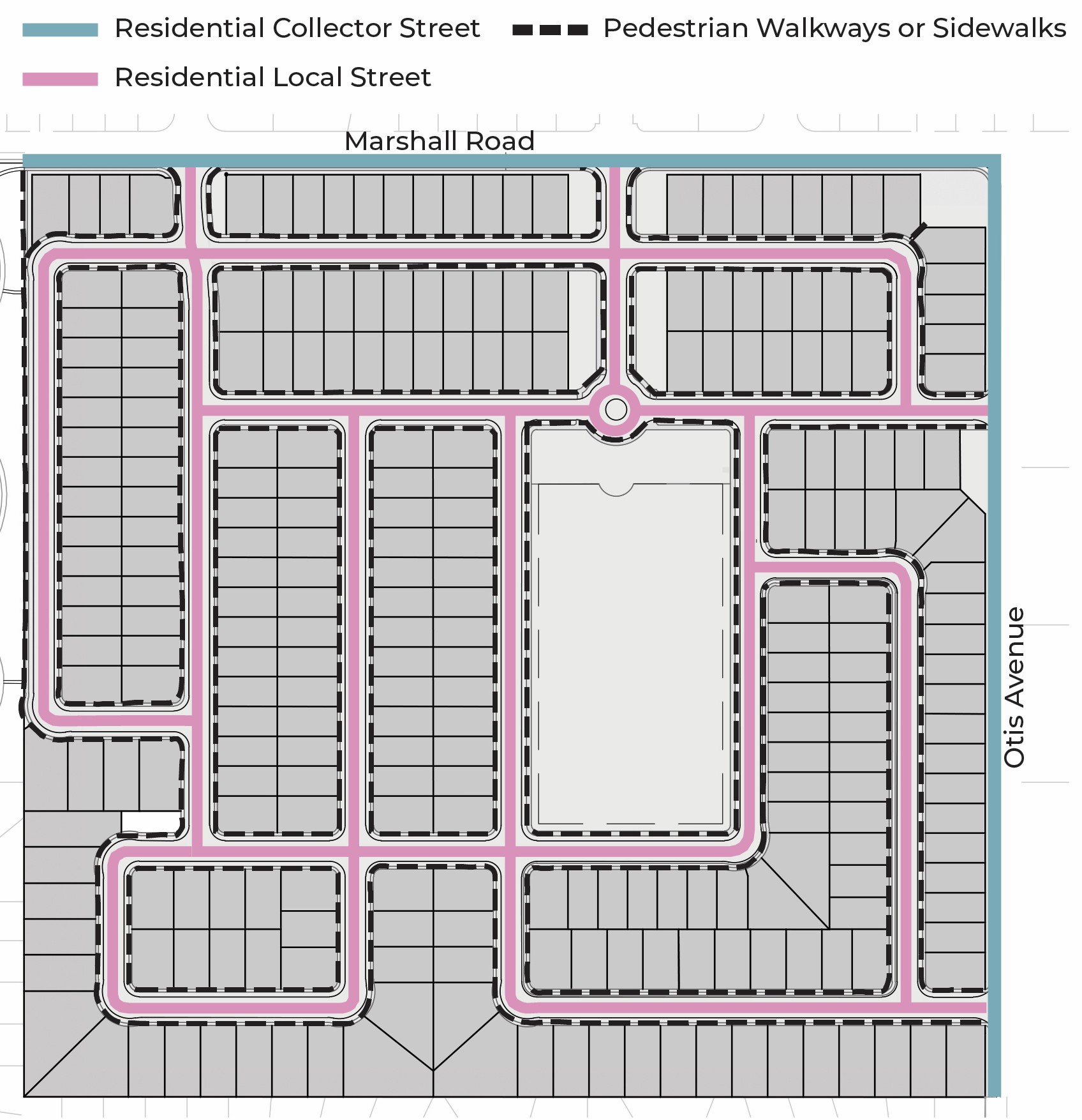 The project includes robust landscaping throughout the neighborhood—along the Marshall Road and Otis avenues perimeter, within internal streets, and around the community recreation basin. Primary trees near the park and main entry are planned with mature canopies typically 30–50 feet wide, and many residential streets will include 8-foot planter strips between sidewalks and the parking or bike lane.