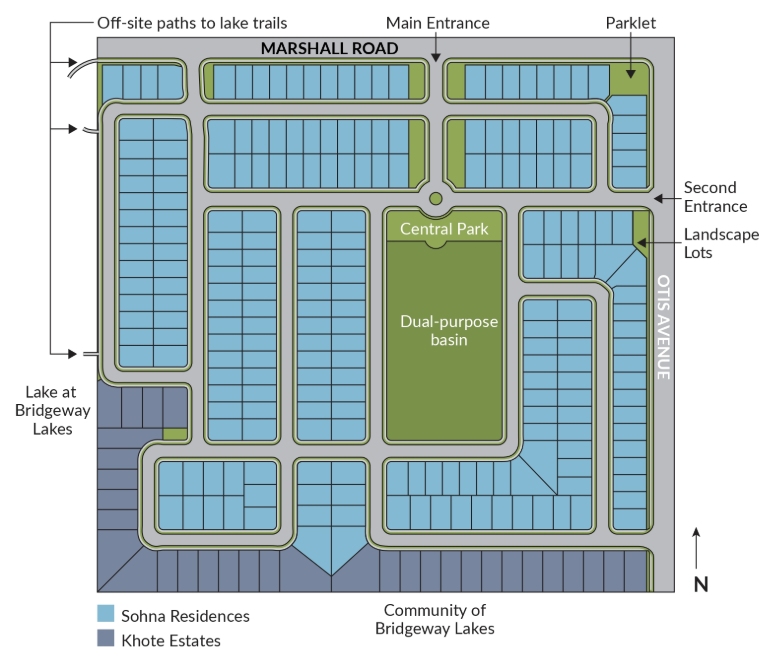 The Brar Farms neighborhood is planned on approximately 60 acres in the Southport area, bordered by Marshall Road and Otis avenues with Bridgeway Lakes to the south and the lake at Bridgeway Lakes to the east. The community includes 259 single-family homes organized into two residential villages, connected by walkable streets, parks, and open space.
